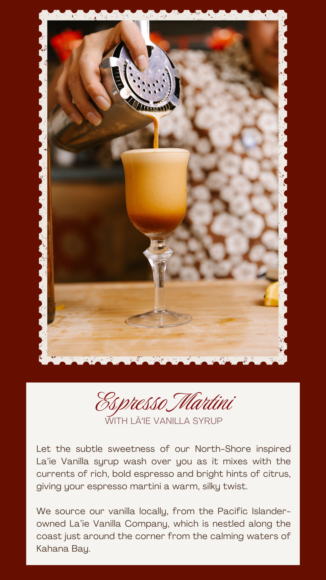 2 shots espresso (about 2 oz)1/2 oz dry Curacao1/2 oz Lā‘ie Vanilla syrup1/8 of an orange, freshly squeezed2.0 oz Añejo Tequila