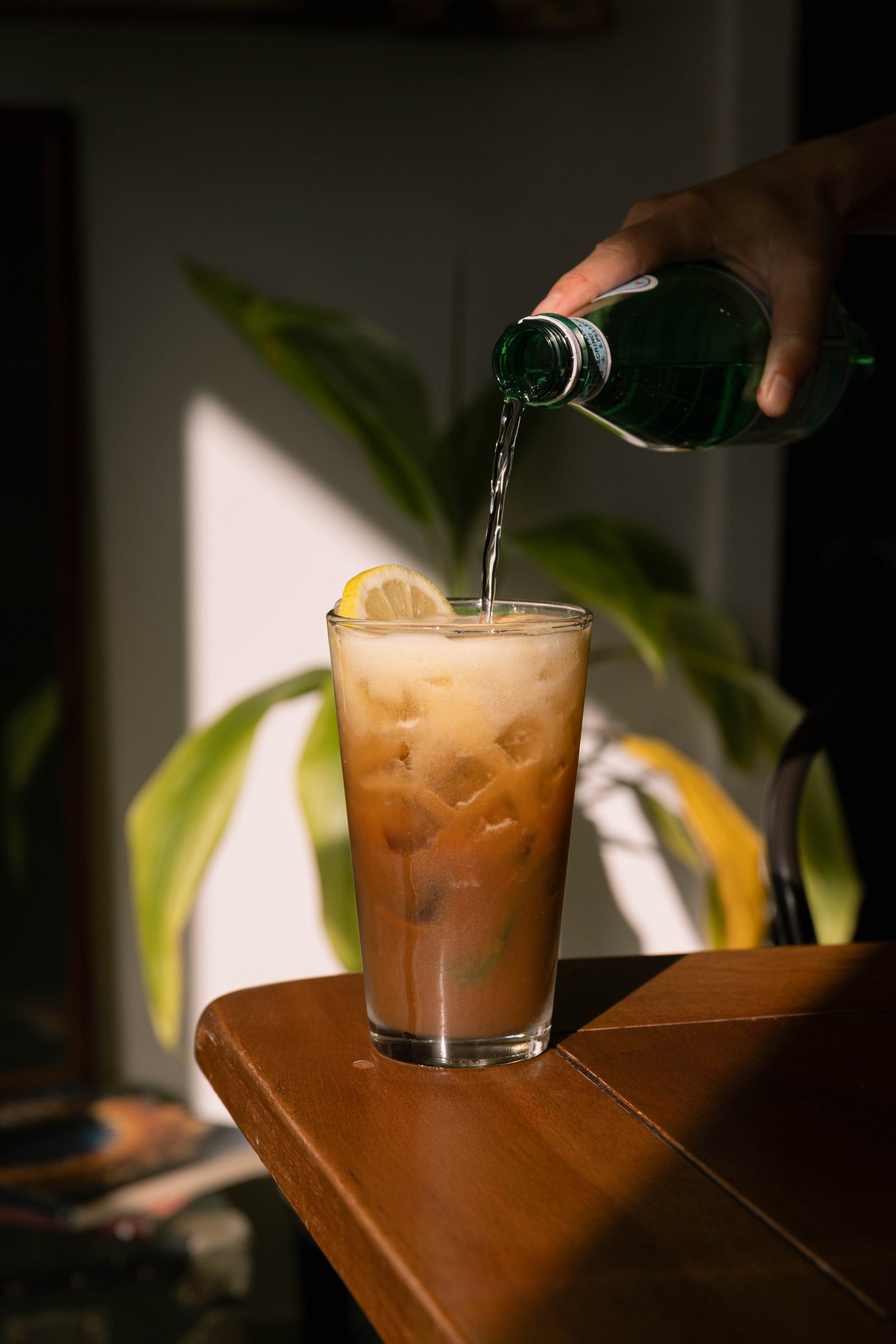 - combine all ingredients in a shaker, vigorously shake, gently pour over sparkling water, and elegantly garnish with a slice of lemon and a sprig of Thai basil