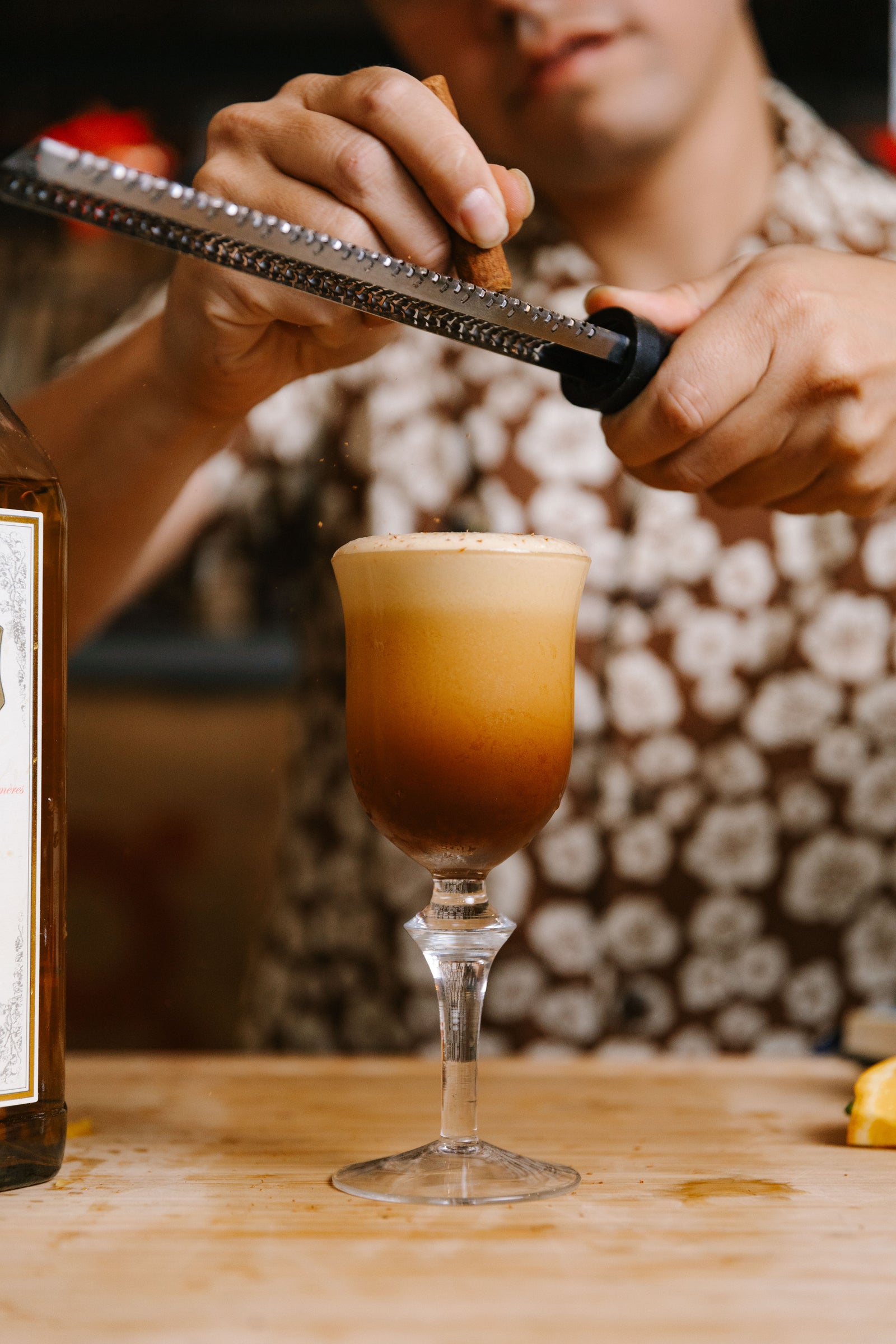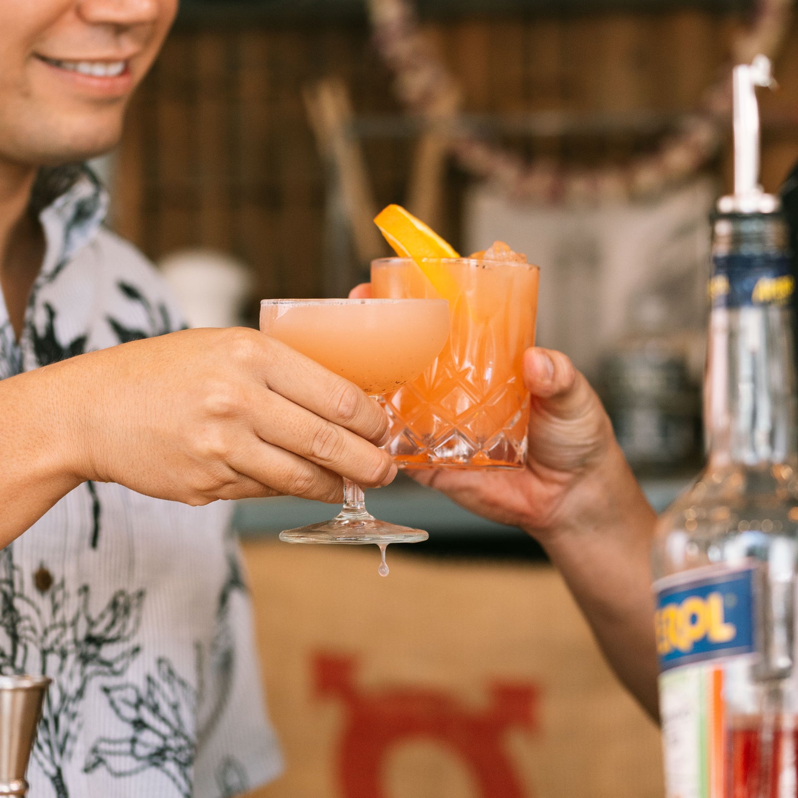1.5 oz mezcal.25 oz aperol.25 oz dry curaçao1.50 oz lychee-hibiscus shrubGarnish with orange slice and black pepperFor the shrub:4 oz crushed lychee4 oz Pono Potions Molokaʻi hibiscus syrup4 oz champagne vinegar1 tsp course black pepper- Let sit in your refrigerator overnight and up to 2 weeks